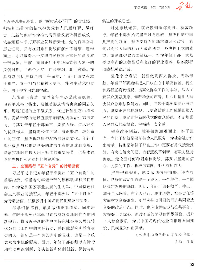 文章指出,3月1日,習近平總書記在2024年春季學期中央黨校(國家行政學院)中青年干部培訓班開班式上作出重要指示強調,年輕干部是黨和國家事業發展的生力軍,是中國特色社會主義事業的接班人,要自覺做黨的創新理論的篤信篤行者、對黨忠誠老實的模范踐行者、矢志為民造福的無私奉獻者、勇于擔當作為的不懈奮斗者、良好政治生態的有力促進者。習近平總書記對年輕干部提出的“五個自覺”,具有豐富的思想內涵和深刻的內在要求,是引導年輕干部健康成長的行動指南。