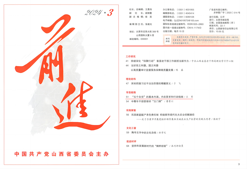 中共山西省委主辦的《前進》雜志2024年第3期刊發我校黨委書記王軍署名文章《“五個自覺”的基本內涵、內在要求和行動指南》。