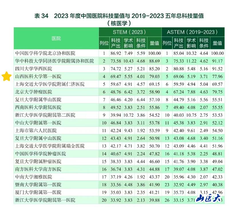 7月19日,中國醫學科學院發布了2023年度中國醫院/醫學院校科技量值以及中國醫院/醫學院校五年總科技量值排名,研究對象覆蓋全國2943家三級醫院。我校第一醫院核醫學科2023年度中國醫院科技量值排名第4,近五年總科技量值排名第5。