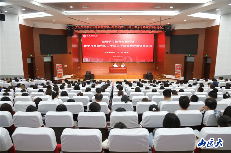 王軍以《高擎全面深化改革旗幟 作答新時代高質量發展課題》為題,從深刻理解黨的二十屆三中全會召開的重大意義,深入學習領會習近平總書記在黨的二十屆三中全會上的重要講話精神,全面準確理解《決定》提出的進一步全面深化改革的重大舉措,全力以赴抓好全會精神貫徹落實等四個方面,對黨的二十屆三中全會精神作了全面宣講和深入闡釋。王軍指出,黨的二十屆三中全會是在以中國式現代化全面推進強國建設、民族復興偉業的關鍵時期召開的一次十分重要的會議。必須深入學習領會習近平總書記在黨的二十屆三中全會上的重要講話精神,深刻認識黨的二十屆二中全會以來黨和國家事業取得的重大成就、深刻認識全會主題、深刻認識進一步全面深化改革的重要性和必要性、深刻認識進一步全面深化改革的重大原則、深刻認識推進改革中需把握的一些重大問題、深刻認識黨中央對下半年工作的重要部署。必須全面準確理解《決定》提出的進一步全面深化改革重大舉措,重點把握黨的二十屆三中全會關于教育綜合改革的重要部署,立足山醫實際,在構建大思政工作體系、深化教育評價改革、完善學?萍即蔥綠逯、優化教師教育體系和管理體制、加強人才發展體制機制改革等辦學治校各方面各領域,著力推進綜合改革,堅定不移把黨的二十屆三中全會精神轉化為建設教育強國的生動實踐。必須全力以赴抓好全會精神貫徹落實,要把學習貫徹全會精神同學習領會習近平總書記關于全面深化改革的一系列新思想、新觀點、新論斷結合和貫通起來,要加強組織領導、整體統籌推進,要以釘釘子精神抓好各項改革任務的落實。