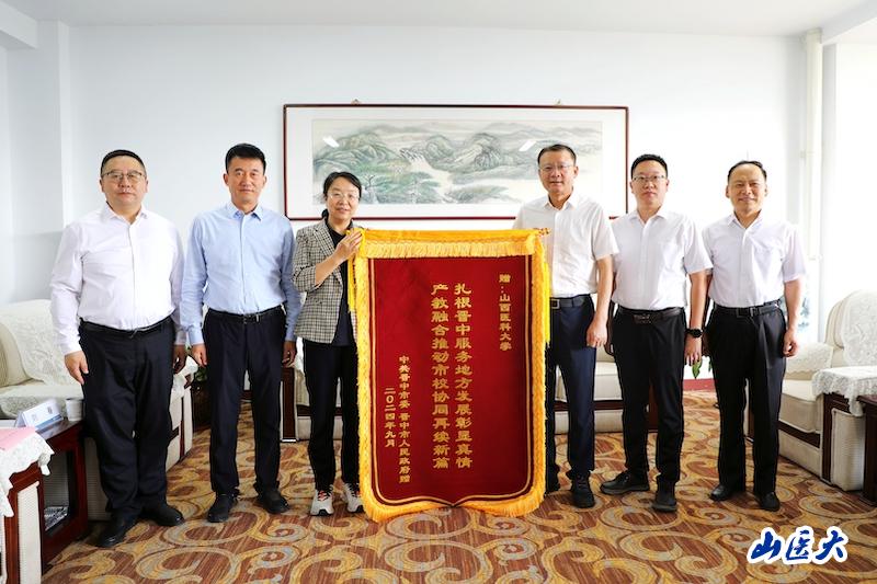 座談會后,張擁軍代表市委、市政府向學校贈送“扎根晉中服務地方發展彰顯真情,產教融合推動市校協同再續新篇”錦旗。在中秋來臨之際,晉中市會同學校向每一名新生發送了地方特產、文旅宣傳“新生大禮包”。