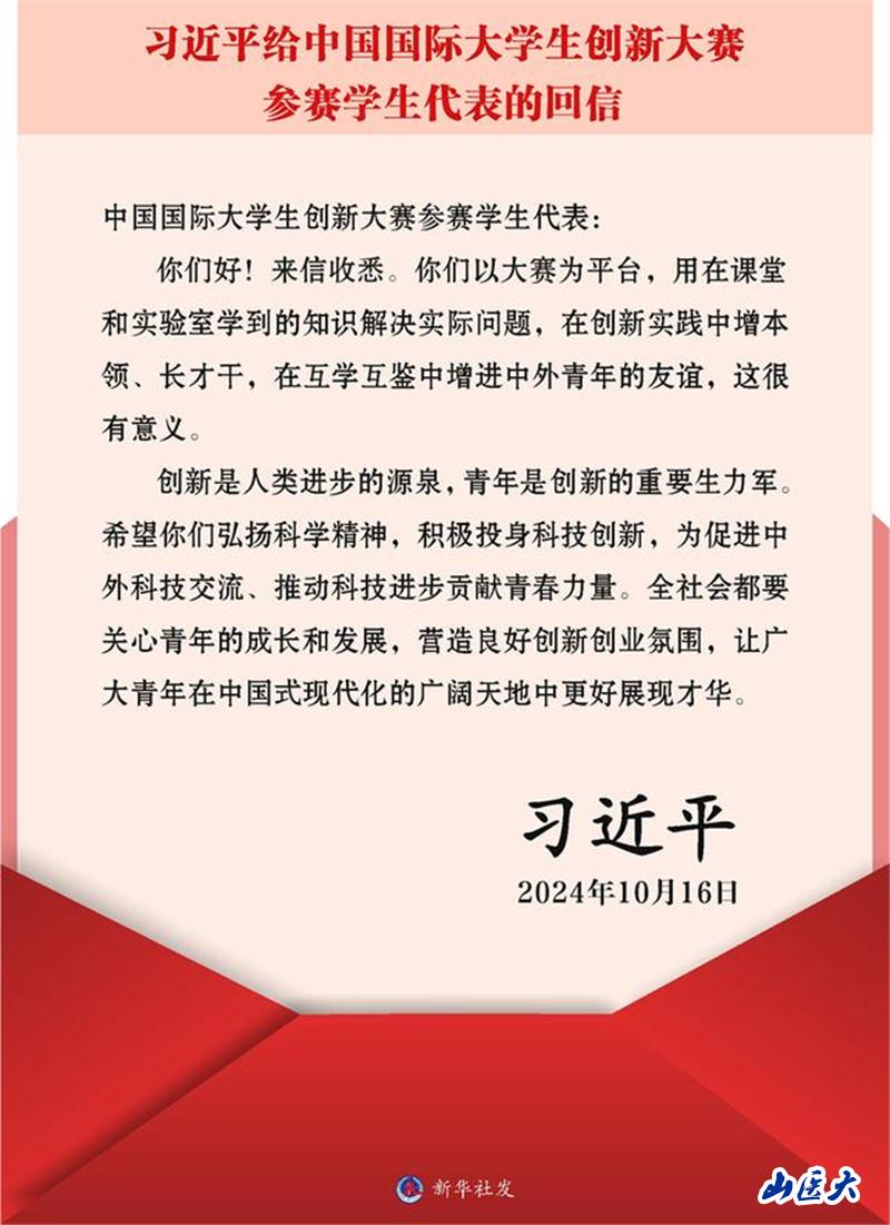 近日,中共中央總書記、國家主席、中央軍委主席習(xí)近平給中國國際大學(xué)生創(chuàng)新大賽參賽學(xué)生代表回信,對他們予以親切勉勵并提出殷切希望。