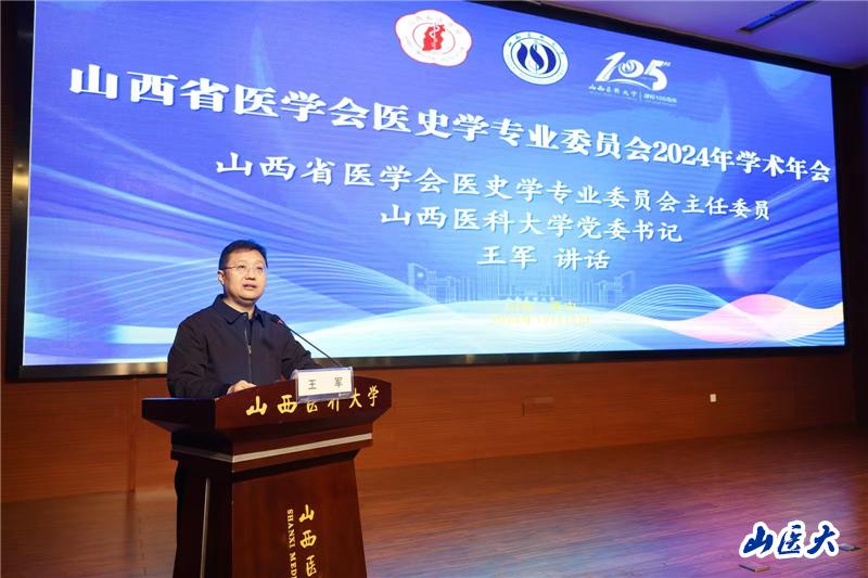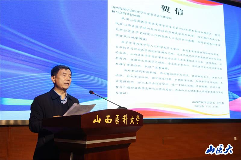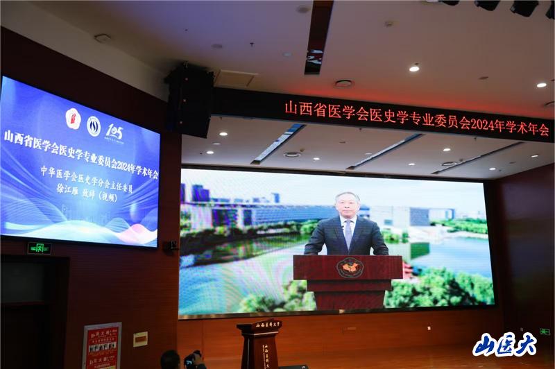 中華醫(yī)學會醫(yī)史學分會主任委員徐江雁向大會發(fā)來視頻致辭,山西省醫(yī)學會會長衛(wèi)小春向大會發(fā)來賀信,山西省醫(yī)學會副會長兼秘書長柴志凱,我校黨委書記王軍,校黨委常委、副校長焦向英出席開幕式并分別致辭。