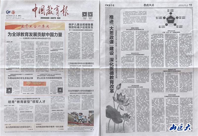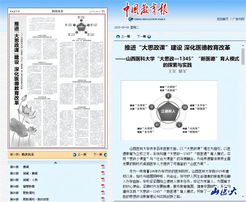 9月9日,《中國教育報》“教改風采”版刊發我校黨委書記王軍、校長解軍的署名文章《推進“大思政課”建設 深化醫德教育改革——c7c7.app“大思政—1345”“新醫德”育人模式的探索與實踐》。