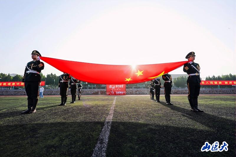 參加典禮的全體人員懷著無比崇敬的心情,共同行注目禮,迎接學校百年華誕日在天安門廣場升起的五星紅旗通過主席臺。隨后,鮮艷的五星紅旗、校旗先后冉冉升起,全體師生面向國旗,肅立行禮,齊唱國歌、校歌。
