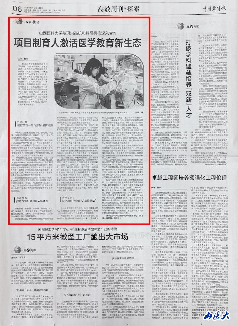 11月12日,《中國教育報》在第6版頭條刊發了我校黨委書記王軍、校長解軍的署名文章《項目制育人激活醫學教育新生態》。
