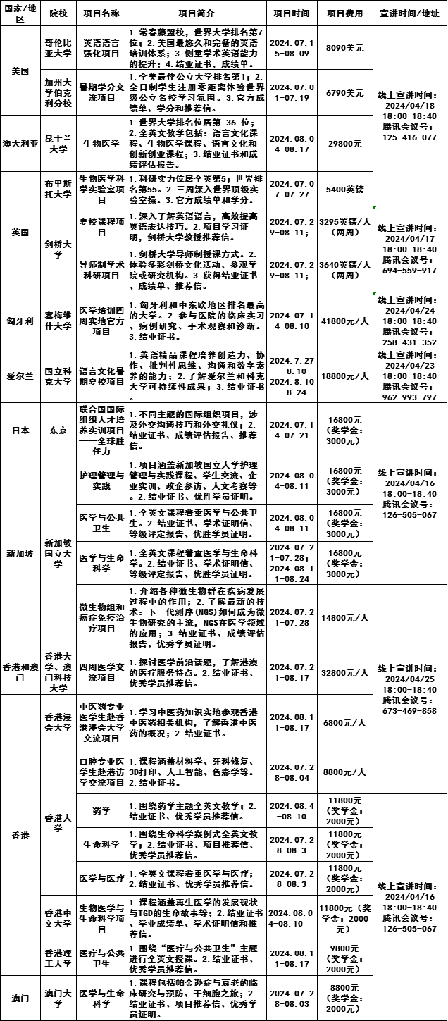為鼓勵品學(xué)兼優(yōu)的學(xué)生積極參與國際交流,培養(yǎng)具有國際視野和跨文化交際能力的國際醫(yī)學(xué)人才,我校在部分項目設(shè)立專項經(jīng)費,資助學(xué)生出國(境)交流(詳見宣講會)。