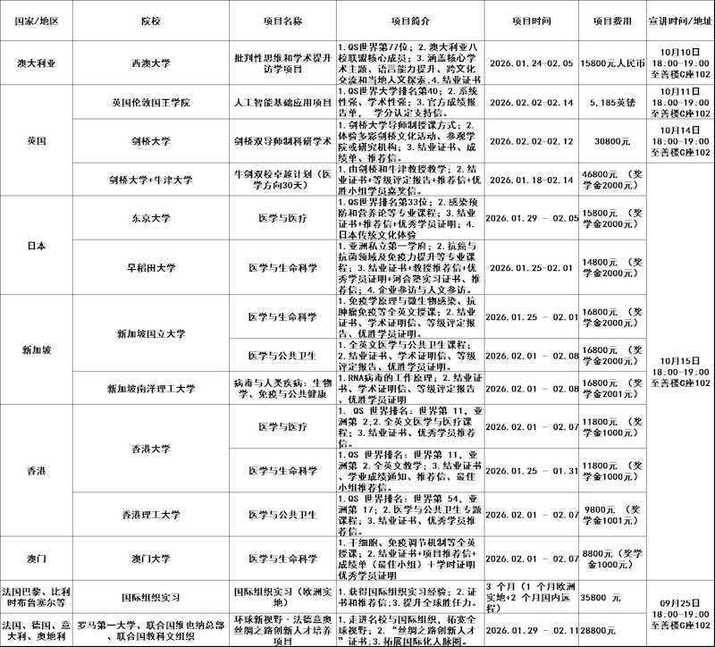 為深入推進人才培養模式改革,加快培養國際化高素質人才,根據學校相關政策,現將報名2026年寒假出國(境)短期線下訪學項目通知如下: