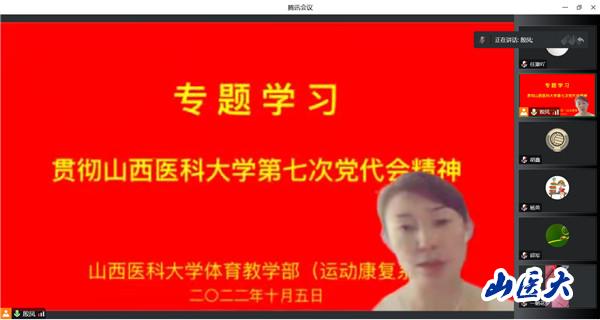 10月5日下午,體育教學(xué)部(運(yùn)動(dòng)康復(fù)系)通過騰訊會(huì)議組織全體系部教職工專題集中學(xué)習(xí)學(xué)校第七次黨代會(huì)精神。會(huì)議由直屬黨支部書記殷鳳主持。