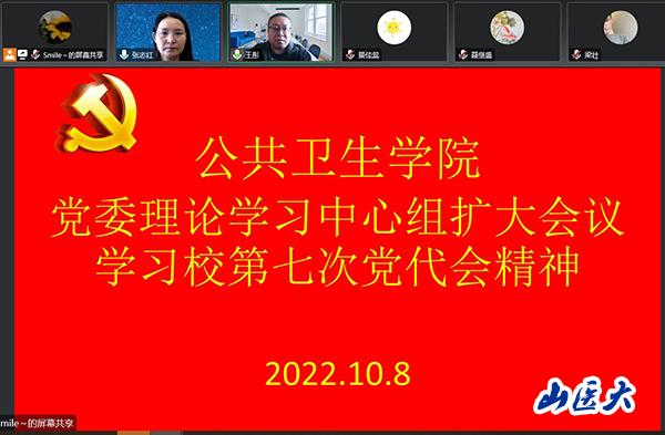 10月8日上午,公共衛生學院以線上騰訊會議方式召開黨委理論學習中心組擴大會議,專題學習學校第七次黨代會精神,學院黨委理論中心組成員、支部書記、組織員、黨員教師代表共20余人參加了會議。學院黨委書記張志紅主持會議。