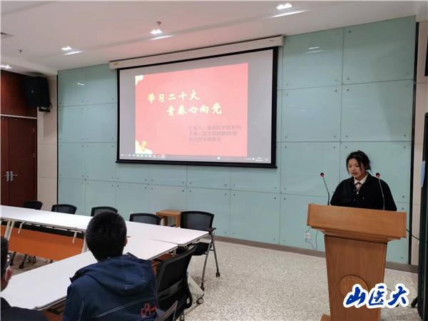 基礎醫學院本科生第二黨支部黨員代表進行學習貫徹黨的二十大精神交流發言。2020級臨床醫學(五年制)專業的呂威震同學談到,我們當代青年要傳承紅色基因,不忘初心使命;要始終善思善學,提高水平境界;更要矢志奮斗擔當,承擔歷史重任。2020級臨床醫學(免費醫學生)專業的馬婕同學說到,我們青年黨員要以擔當彰顯初心使命、以吃苦錘煉過硬本領、以奮斗書寫青春答卷。薛星莉在總結發言時談到,大家要提高政治站位,要深刻領會把握黨的二十大精神的豐富內涵,深學細悟、入腦入心、付諸行動,努力在新的趕考路上當好“答卷人”。
