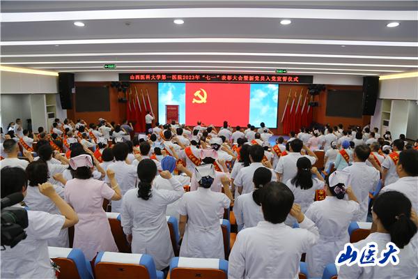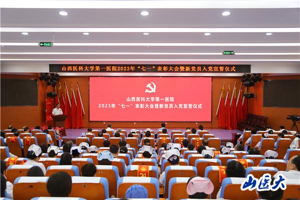 為慶祝中國共產(chǎn)黨成立102周年,6月30日,第一醫(yī)院在護校六層多功能報告廳召開2023年“七一”表彰大會暨新黨員入黨宣誓儀式。院黨委書記徐鈞講話,院黨委副書記吳旭東主持會議。在院領(lǐng)導(dǎo)班子成員,受表彰的優(yōu)秀黨員、優(yōu)秀黨務(wù)工作者、先進基層黨組織,獲得“光榮在黨50年”紀念章的老黨員代表,以及今年新入黨的職工預(yù)備黨員和各黨支部書記、黨支部委員、黨委相關(guān)部門負責(zé)人等200余人參加了會議。