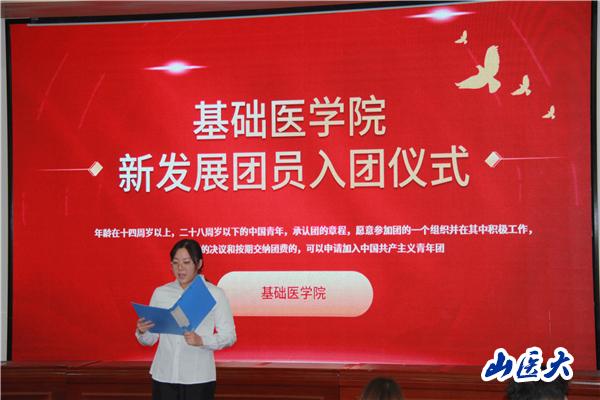 入團(tuán)儀式伊始,全體人員齊唱國(guó)歌。入團(tuán)儀式上,主持人宣讀了基礎(chǔ)醫(yī)學(xué)院171名新團(tuán)員名單。分團(tuán)委書記和優(yōu)秀團(tuán)員代表為新團(tuán)員頒發(fā)團(tuán)員證、佩戴團(tuán)徽。優(yōu)秀團(tuán)員代表2021級(jí)臨床醫(yī)學(xué)(五年制)李昊陽(yáng)同學(xué)領(lǐng)誓,全體新老團(tuán)員面向鮮艷的團(tuán)旗,莊嚴(yán)宣誓。2021級(jí)生物制藥專業(yè)白楊茹玉作為優(yōu)秀團(tuán)員代表作表態(tài)發(fā)言 ,她表示,中國(guó)共產(chǎn)主義青年團(tuán)共青團(tuán)是黨的助手和后備軍,不僅要從思想上加入團(tuán)組織,更應(yīng)該在行動(dòng)中發(fā)揮團(tuán)員模范帶頭作用,努力奮斗,追求卓越,永遠(yuǎn)銘記奮斗是青春最靚麗的底色。2021級(jí)臨床醫(yī)學(xué)(五年制)周奕欣作為新團(tuán)員代表發(fā)言,她認(rèn)為,通過(guò)這次入團(tuán)儀式,更加深入了解中國(guó)共產(chǎn)主義青年團(tuán)的宗旨和使命,增強(qiáng)了對(duì)團(tuán)組織的歸屬感和認(rèn)同感,以后將更加努力學(xué)習(xí)、積極向上,認(rèn)真履行團(tuán)員義務(wù)。“