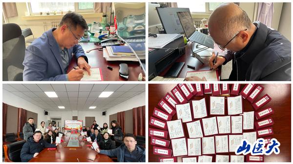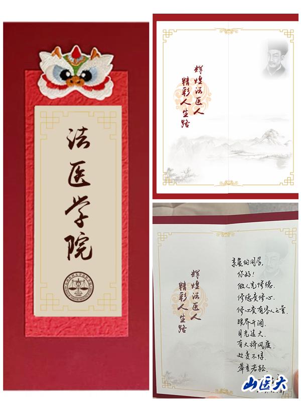 明德樓B座法醫學院會議室,一張張喜慶的朱砂紅底帶有龍角卡通頭像和院徽的定制賀卡,整齊地擺放在會議桌上,淺黃色賀卡內頁左側印有“精彩人生路 輝煌法醫人”標語,右上角印有“法醫學之父”宋慈頭像,具有法醫學專業特色的專屬賀卡,經學院全體教師抒寫新年寄語,將通過“擊鼓傳花”的方式送到同學們手中。