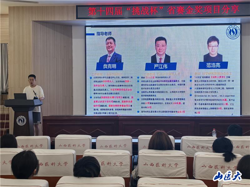 本次活動邀請了我校在第十四屆“挑戰杯”山西省大學生創業計劃競賽獲得金獎的團隊代表,他們依次上臺分享了各自的參賽項目及備賽經驗,四件作品分別是《大國重器——中國“智”造法醫身份鑒識系統》《ICH腦視清——可視精準穿刺,腦部安全引流》《福銳森——開啟惡性腫瘤骨轉移精準診療新時代》《毒易檢——開創毒品快速精準檢測新時代》。