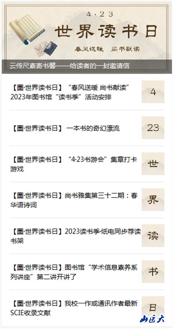 4月23日是第28個(gè)世界讀書日。為充分發(fā)揮圖書館的文化傳播和教育功能,營造良好的校園閱讀文化氛圍,圖書館以“春風(fēng)送暖,尚書獻(xiàn)讀”為主題,開展了一系列形式多樣、內(nèi)容豐富的閱讀推廣活動(dòng)。