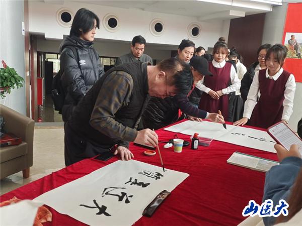 在開幕式上,董海濤介紹了出席活動的各位嘉賓。郭炳麟教授介紹了本次布展情況,對學校的支持表示衷心感謝,同時希望師生在欣賞藝術作品的過程中,加深對中國共產黨歷史、中華優秀傳統文化與中國特色社會主義道路的認識,堅定不移聽黨話、跟黨走。隨后,郭炳麟教授引導大家共同觀賞展品。開幕式現場還邀請了張建亞、張建國、馬治龍三位書法家潑墨揮毫,并與學生親切交流創作技巧與經驗。