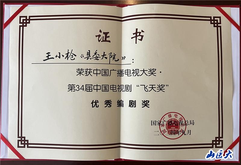 9月21日晚,第34屆“飛天獎”頒獎典禮在廈門舉辦,我校校友、著名青年影視劇作家王小槍憑借《縣委大院》榮獲第34屆飛天獎優秀編劇獎,這也是他繼2023年第28屆上海電視節獲得白玉蘭獎最佳編劇(原創)獎后再次斬獲中國電視劇的重要獎項。同時《縣委大院》也榮獲本屆飛天獎優秀電視劇獎。