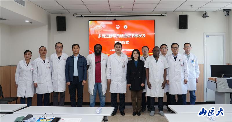 趙斌在致辭中指出,自1975年起,我校第二醫(yī)院便致力于援助非洲的醫(yī)療衛(wèi)生事業(yè),迄今為止已派遣超過100名醫(yī)療護(hù)理專家前往多哥、喀麥隆、吉布提等非洲國家,開展廣泛的醫(yī)療援助工作。2013年,醫(yī)院因在援外醫(yī)療工作中的杰出貢獻(xiàn),榮獲“全國援外醫(yī)療工作先進(jìn)集體”榮譽(yù)稱號。此次結(jié)業(yè)的三位多哥學(xué)員積極刻苦、勤奮上進(jìn)、友好和善,也希望他們未來再次來中國學(xué)習(xí)交流。