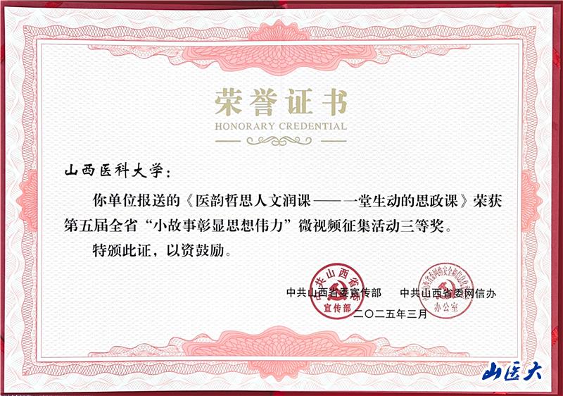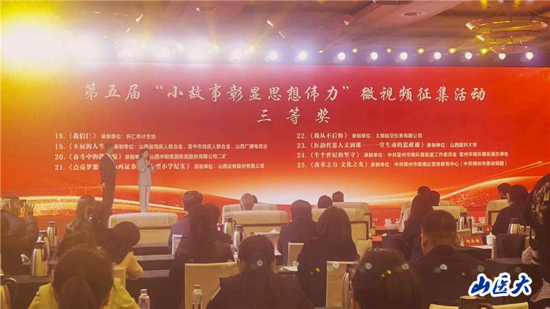 3月17日,3月17日,第五屆全省理論宣講大賽暨“小故事彰顯思想偉力”微視頻優秀作品展演頒獎活動在太原舉行。省委常委、宣傳部部長張碧涌出席并為獲獎選手和單位頒獎。 我校視頻作品《醫韻哲思 人文潤課——一堂生動的思政課》榮獲三等獎。