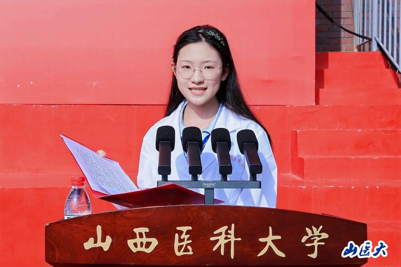 在此,我謹代表全體新生鄭重承諾:一是要堅守初心,刻苦求知。我們會追求“醫理博精”,尊重老師、認真聽課,把每一門基礎課學扎實,為未來的專業學習打下堅實根基。二是要錘煉醫德,提升能力。我們會以“德能高邃”為目標,在學校“大思政-1345”“新醫德”育人模式下,培養同理心、責任感,努力成長為“德才兼備”的醫學生。三是要勇于探索,全面發展。我們會主動適應大學生活,學會管理時間,在學校“數智腦-1346”新醫科人才培養模式下,學習專業知識,積極參與科研實踐、社團活動,既要保持身心健康,也要拓寬國際視野,為未來參與醫療事業發展做好準備。
