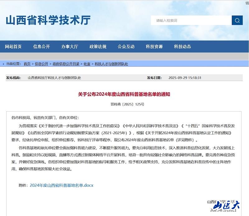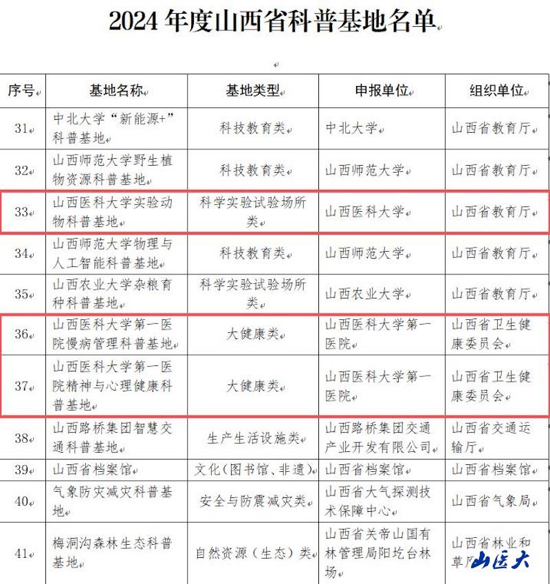 近日,山西省科技廳公布了2024年度山西省科普基地名單,我校獲批“實(shí)驗(yàn)動物科普基地”“慢病管理科普基地”和“精神與心理健康科普基地”3個(gè)“山西省科普基地”,這是學(xué)校在弘揚(yáng)科學(xué)家精神、履行社會責(zé)任、推動醫(yī)學(xué)科學(xué)知識普及方面的又一重要成果。