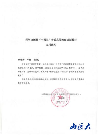 多年來,牛僑教授承擔本科生和研究生的教學,長期致力于多層次教材建設,曾主編普通高等教育“十五”“十一五”和“十二五”規劃教材《職業衛生與職業醫學》(中國協和醫科大學出版社)、《職業衛生與職業醫學(雙語教材)》(人民衛生出版社)和《預防醫學》(英文改編版、科學出版社),在業內享有良好的聲譽。
