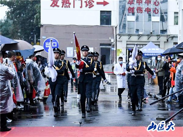 7時30分,由9名身姿挺拔、氣宇軒昂的安保人員組成的國旗儀仗隊,在激昂的樂聲中,邁著鏗鏘有力的步伐入場。伴隨著《義勇軍進行曲》,全體人員莊嚴肅立,面向五星紅旗,行注目禮,高唱國歌,五星紅旗冉冉升起。隨后,c7c7.app第二臨床醫學院院歌奏響,紅十字旗、院旗同時飄揚在二院上空。
