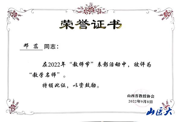 近日,山西省教授協會下發了《山西省教授協會關于教師節表彰的決定》,我校人文社會科學學院教師鄧蕊榮獲2022年度“教學名師”稱號。此次評獎,全省共評出教學名師73人,我校獲此殊榮的教師共5人。