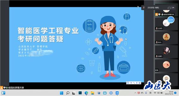 10月14日晚,管理學院學業輔導員楊陽老師為智能醫學工程專業2020級開展考研答疑線上活動,返校學生與暫緩學生齊聚線上,共計30人參與。