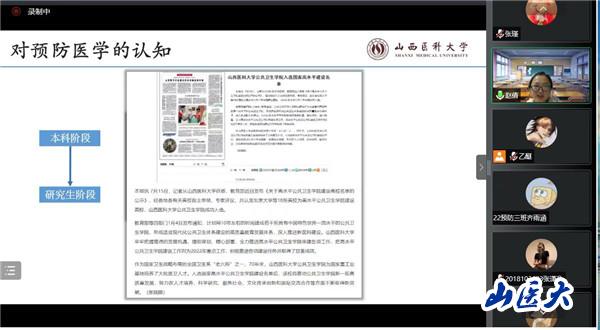 隨后,現就職于天津市南開區疾病預防控制中心的王琦、就職于大連長興島海關的吳欣桐二位學姐分享了她們在校時的學習、工作、實踐經驗,鼓勵同學們在大學期間要盡早樹立目標,明確方向,豐富自己的綜合技能。她們結合自身工作經歷,使同學們深刻體會到在疫情大環境下公共衛生所發揮的重要作用,同學們對于自己身為公衛人的自豪感油然而生,增強了專業自信。