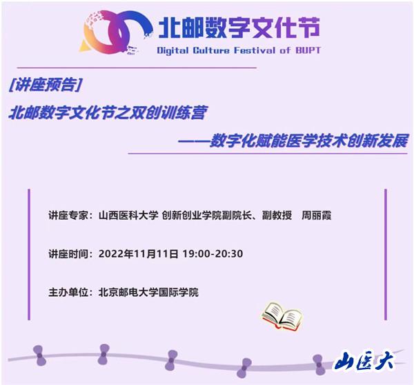 11月18日,我校創新創業學院周麗霞副教授受邀在線上為北京郵電大學“北郵數字文化節”做了題為“數字化賦能醫學技術創新發展”的專題講座。