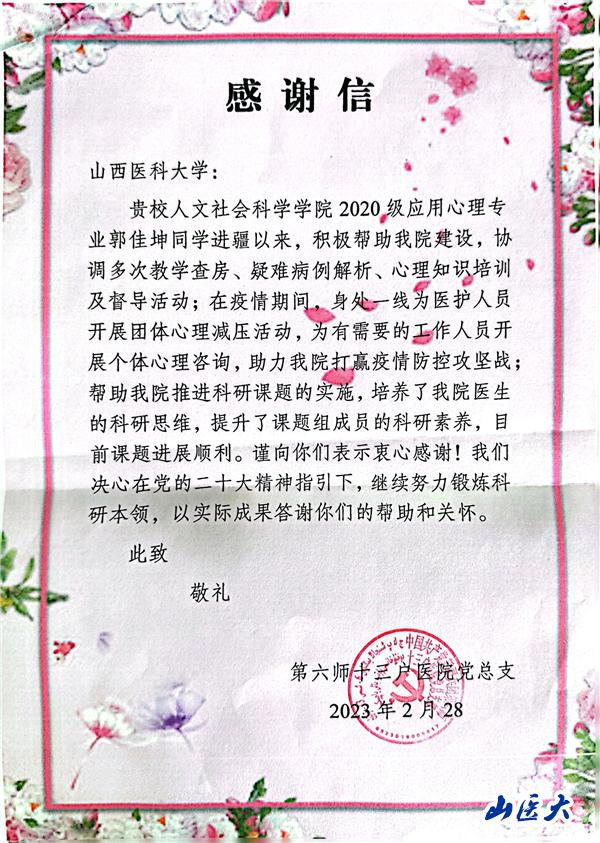 郭佳坤同學以兢兢業業的工作態度,不求回報的奉獻精神,展現了山醫人的良好精神風貌和工作擔當,得到了群眾的一致好評。