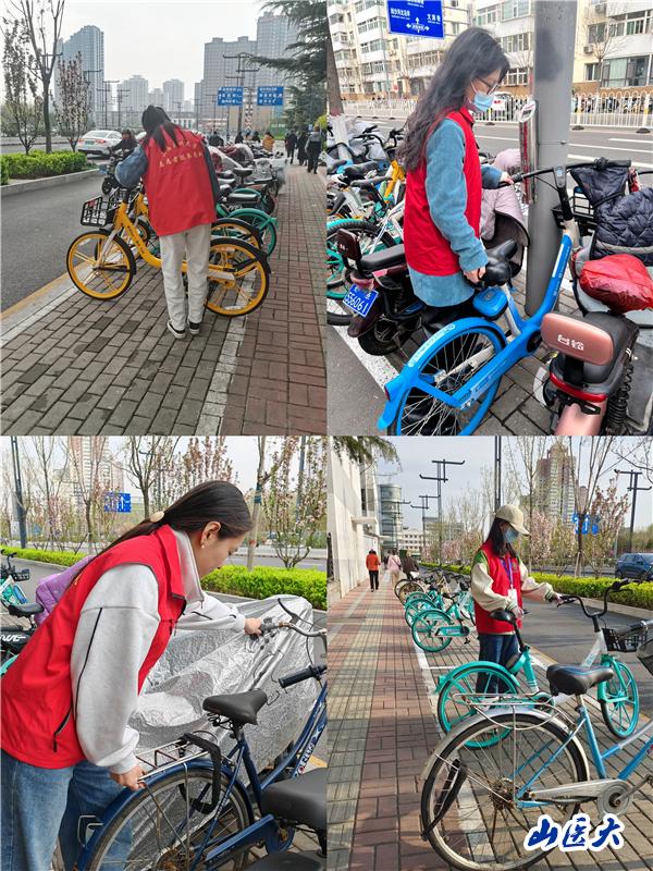 志愿者們還開展了“擺放共享單車 倡導文明騎行”的志愿服務活動。將校園周邊沿街亂停亂放的共享單車進行統一規范整理,將倒在路旁的共享單車集中搬至規定的區域內停放,并對車內的殘留垃圾進行清理,把周邊的共享單車擺放整齊。同時引導過往居民,自覺維護、愛護身邊的共享單車,做文明的騎行者、停放者、宣傳者。