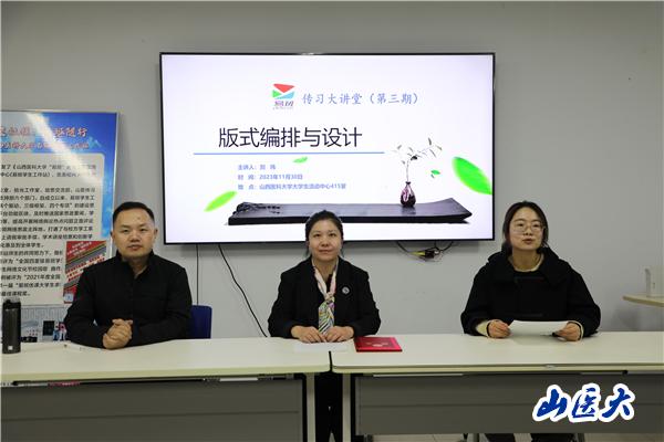11月30日晚,學生工作部易班學生工作站在中都校區大學生活動中心415室舉辦了第三期“傳習大講堂”——版式編排與設計。培訓由山西應用科技學院副教授劉瑋主講,學生工作部副部長楊潔出席,易班學生工作站指導老師王玉男主持,易班學生工作站成員參加培訓。