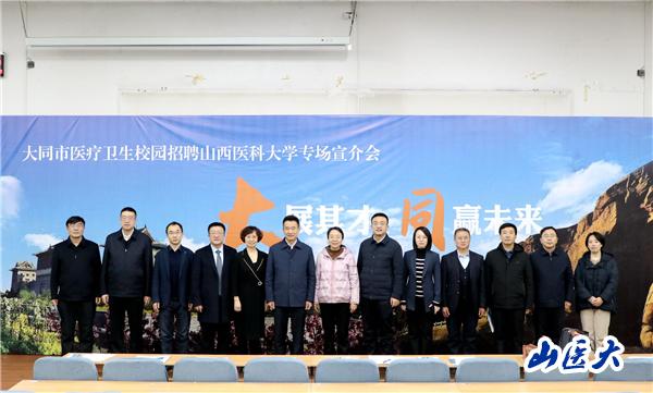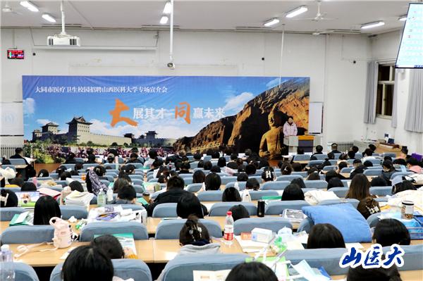 為深入開展2024年“書記校長訪企拓崗促就業”專項行動,12月7日晚,我校在迎澤校區第二十二教室舉辦“大展其才·同贏未來”大同市校園招聘專場宣介活動。校黨委副書記彭月蘭,校黨委常委、副校長劉春出席會議。大同市衛健委黨組書記、主任紀青,大同市委組織部副部長鄭天杰,大同市衛健委黨組成員、副主任張曉瓊,大同市第一人民醫院黨委書記閆莉,大同市第二人民醫院院長范文有,大同市第三人民醫院副書記董艷陽,大同市第四人民醫院副院長崔模林,大同市第五人民醫院黨委書記尉杰忠、副院長郭勝,大同市中醫醫院院長盧杉等領導出席會議。校黨委人才工作部、研究生學院黨委、畢業生就業指導中心等相關部門負責人及200余名2024屆應屆畢業生參加會議。