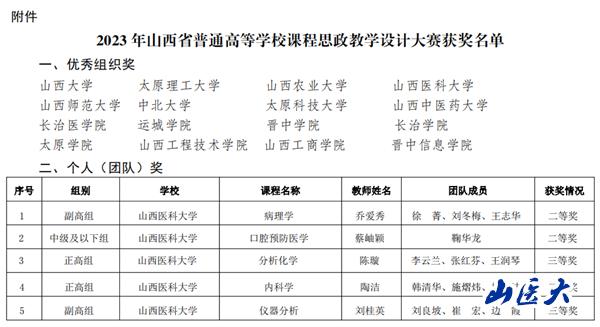 近日,山西省教育廳公布了2023年山西省普通高等學?緯趟頰教學設計大賽暨第四屆全國高校教師教學創新大賽山西賽區課程思政組別比賽結果。我校榮獲優秀組織獎,基礎醫學院喬愛秀、汾陽學院蔡岫穎獲得二等獎,藥學院陳璇、第一臨床醫學院陶潔和公共衛生學院劉桂英獲得三等獎。