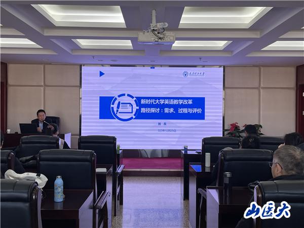 劉兵教授進行了題為《新時代大學英語教學改革路徑探討:需求、過程與評價》的講座。他從大學英語教學現狀出發,分析了新時代背景下英語教學改革的多方面需求,同時從教學設計、教學實施和教學效果三個方面,分享了太原理工大學本科、研究生外語教學改革的實踐經驗,為新醫科背景下我校英語教學改革提供思路。通過分享經典研究,劉兵教授還特別強調了“教學相長”,教學與科研相互促進,為我系教師提供了寶貴的啟示。