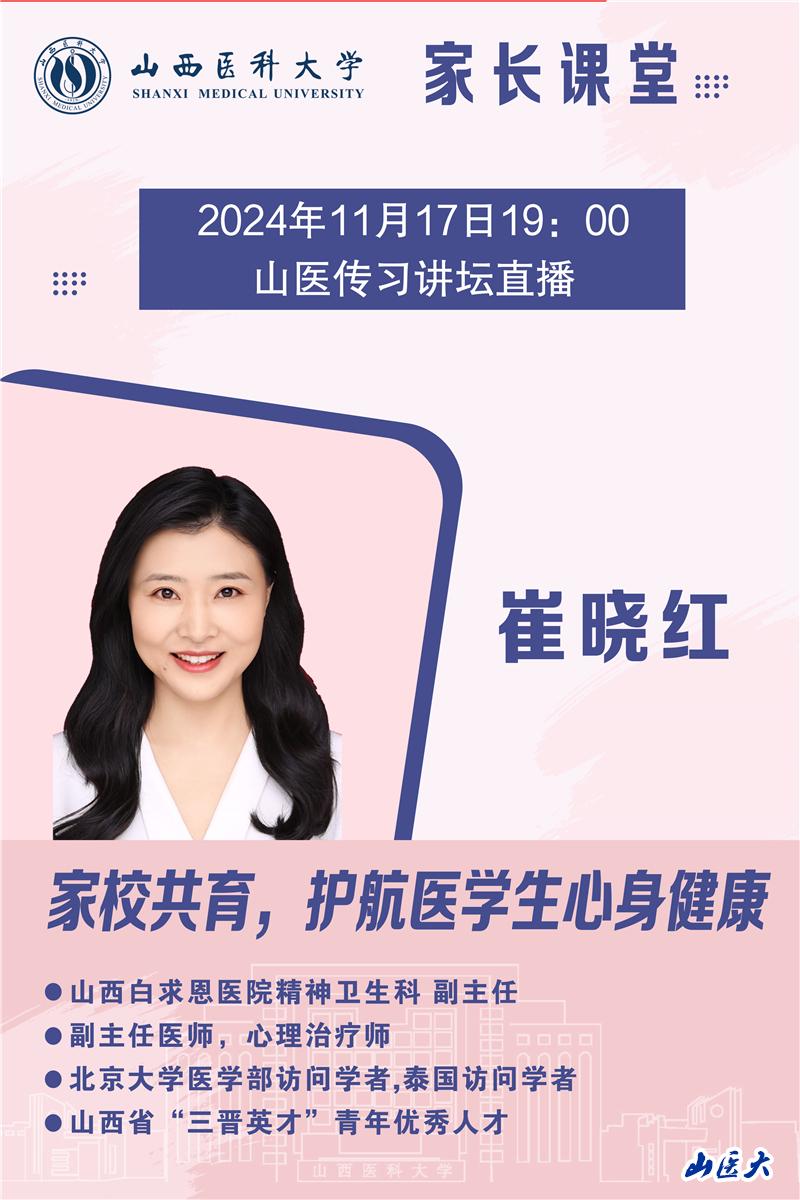 11月17日晚,學校心理健康教育中心線上召開“家校共育,護航醫學生身心健康”主題活動,邀請到山西白求恩醫院精神衛生科副主任、副主任醫師、心理治療師,北京大學醫學部訪問學者、泰國訪問學者,山西省“三晉英才”青年優秀人才崔曉紅主講。此次活動共有4465名家長熱情參與。