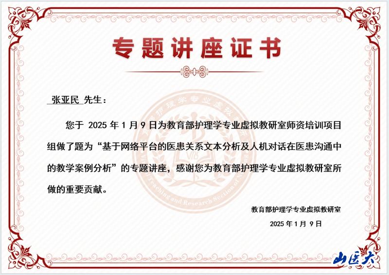 分享結束后,教育部護理學專業虛擬教研室師資培訓項目組為張亞民老師頒發了專題講座證書。本次報告為教師實施人機對話教學中模擬醫患關系病例的選擇、設計與應用提供了范例,為綜合設計型、創新型實踐教學改革提供了參考和借鑒。