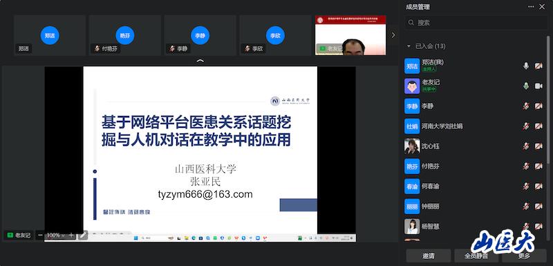 1月9日,教育部護理學虛擬教研室舉辦線上學術交流活動,特邀我校臨床技能教學模擬醫院張亞民老師擔任主講嘉賓,做題為“基于網絡平臺醫患關系話題挖掘與人機對話在教學中的應用”的專題報告。本次會議由教育部護理學虛擬教研室師資培訓專項組副組長鄭潔教授主持,來自全國各高校的護理學骨干教師參加。