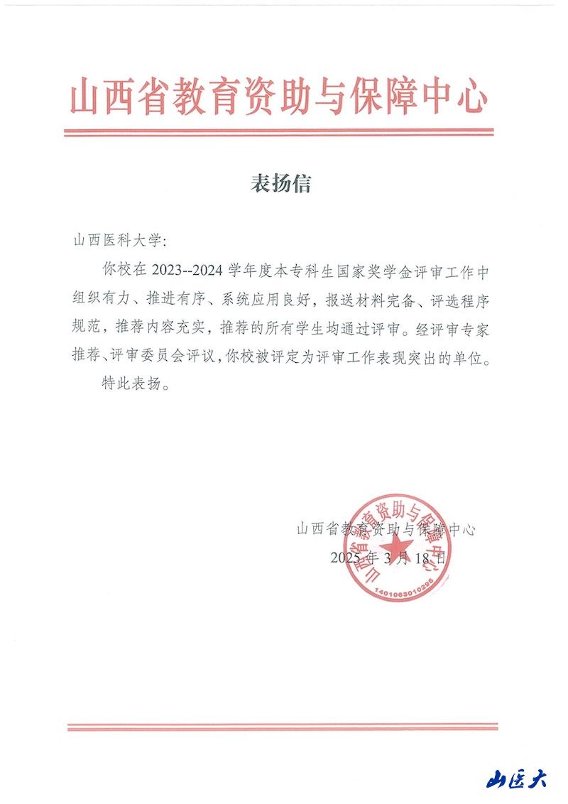 近日,山西省教育資助與保障中心向我校發來表揚信,高度肯定我校在2023-2024學年度本科生國家獎學金評審工作中的表現,授予我?!霸u審工作表現突出的單位”稱號。