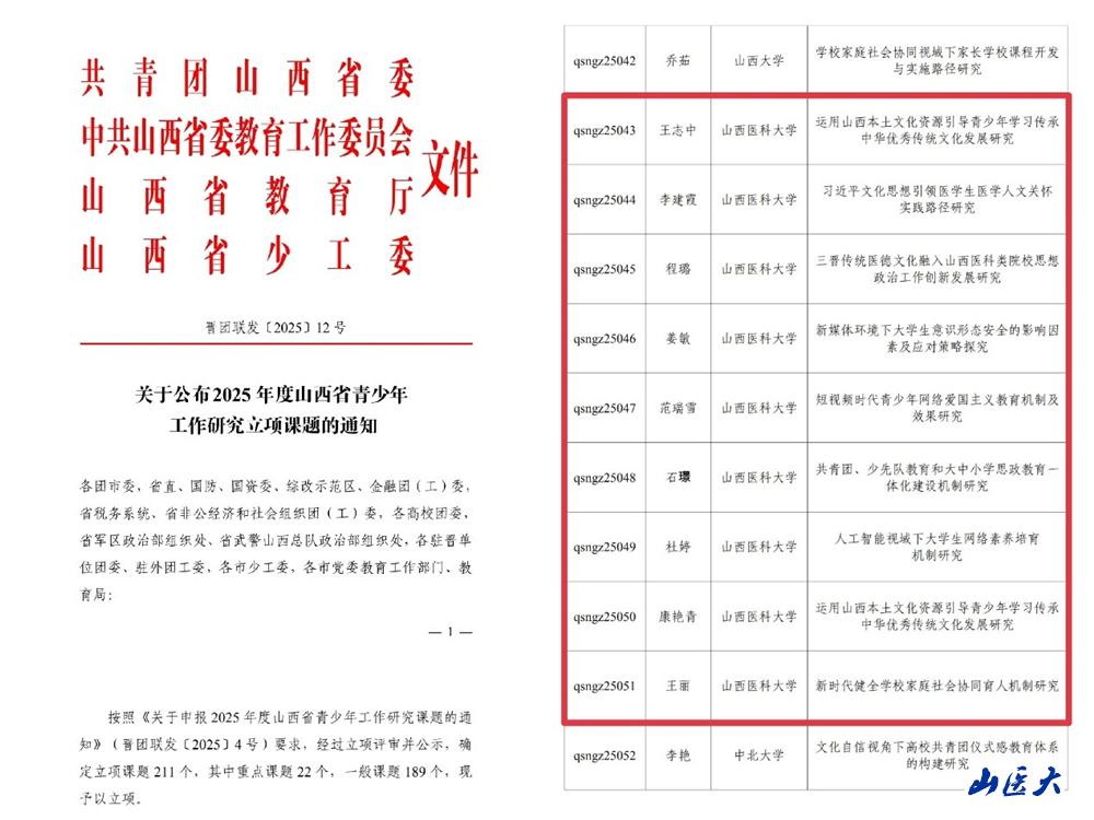 近日,共青團山西省委、山西省社會科學院(山西省人民政府發展研究中心)、山西省少工委聯合發布了2025年度山西省青少年發展研究課題和山西省青少年工作研究課題立項通知,我校及附屬醫院申報的26個課題獲批立項。