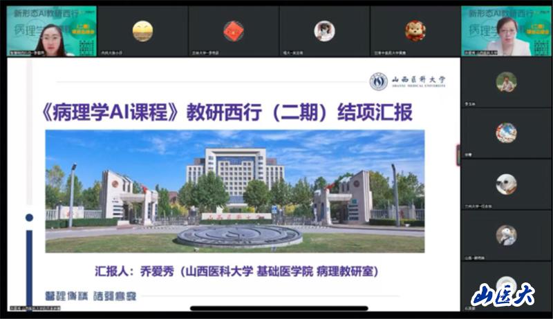 張宇在致辭中指出,AI技術作為當今科技發展的前沿,在醫學領域的應用,尤其是在病理學領域有著廣闊的前景,將AI技術與病理學教育相結合,開展新形態的教研工作,是推動醫學教育現代化,提升教育質量的重要舉措。參會的7所高校的項目負責人先后匯報了項目實施情況。喬愛秀詳細介紹了參加此項目的實施過程、成果收獲和心得體會。在2024年4月至2025年6月項目實施期間,我校教學團隊積極參加同步課堂、同課異構、專項培訓等教研活動,以吉林大學《病理學AI課程》為基。胄值茉盒9慚、共用、共享、共創,共同探索AI賦能醫學教育的新路徑。