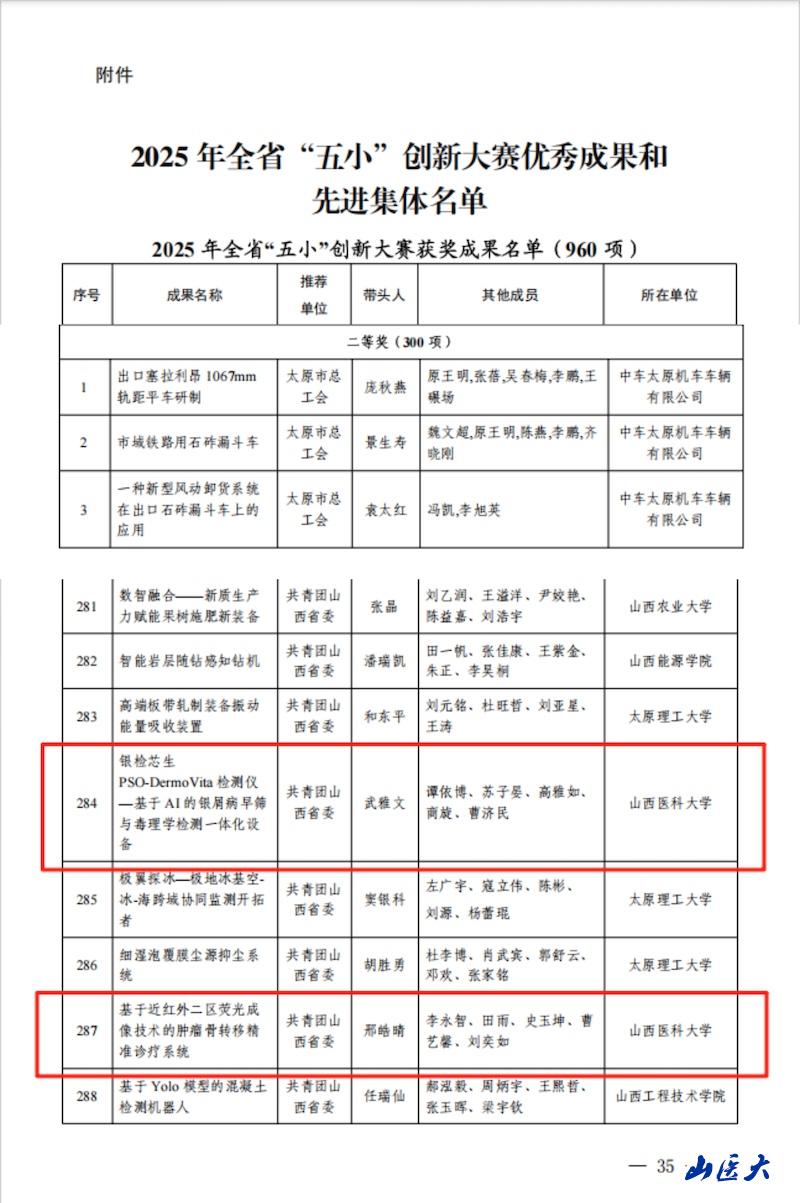 近日,由山西省總工會、共青團山西省委、山西省科學技術協會組織評選的山西省2025年“五小”創新大賽評審結果公布,我校學子三項創新成果登榜獲獎,充分展現了學校在生物醫藥、智能醫療領域的創新活力與人才培養成效。