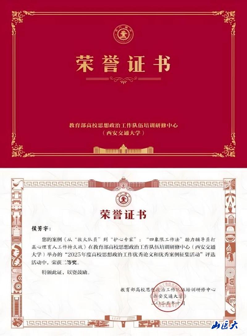 近日,教育部高校思想政治工作隊伍培訓研修中心(西安交通大學)公布“2025年度高校思想政治工作優秀論文和優秀案例征集活動”評選結果。我?誶灰窖г核枷胝治輔導員、暢游青春輔導員工作室負責人侯芳宇提交的案例《從“救火隊員”到“護心專家”:“四象限工作法”助力輔導員打贏心理育人工作持久戰》榮獲優秀案例二等獎。