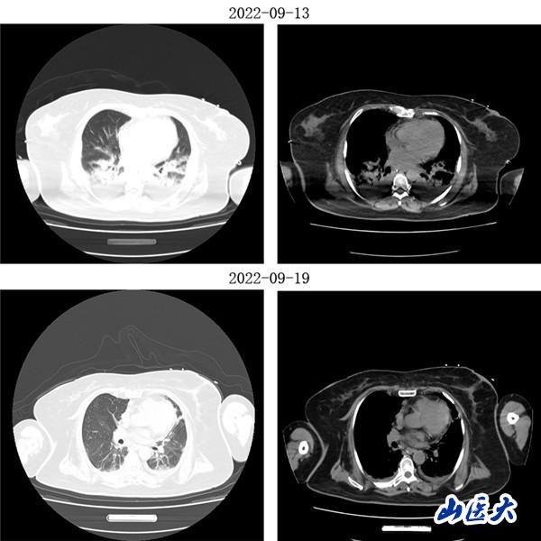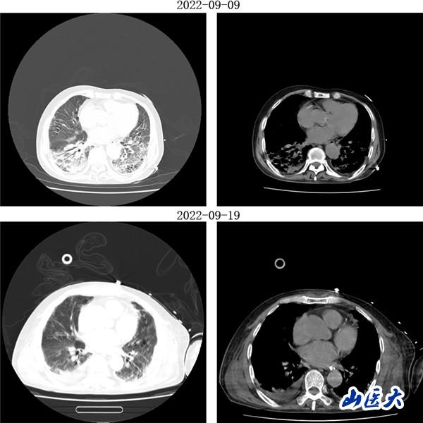 重癥醫學科三病區張文凱主任團隊深入分析了兩位患者的病情。考慮到兩名老年患者均已出現急性呼吸窘迫綜合征,決定采用俯臥位通氣技術為他們治療。在張文凱主任的指導下,侯林義主治醫師帶領張承、孫潔住院醫師對女性患者經俯臥位通氣治療,92小時后復查胸部CT,雙肺明顯好轉,氧合指數由90上升至300mmHg以上,吸氧濃度由100%降至35%,ARDS明顯改善;對男性患者,采用聯合持續性血液濾過(CRRT)治療方案,經俯臥位通氣治療66小時后復查胸部CT,顯示明顯改善,同時氧合指數由102上升至360mmHg左右,吸氧濃度需求下降至40%,全身水腫情況也明顯減退。