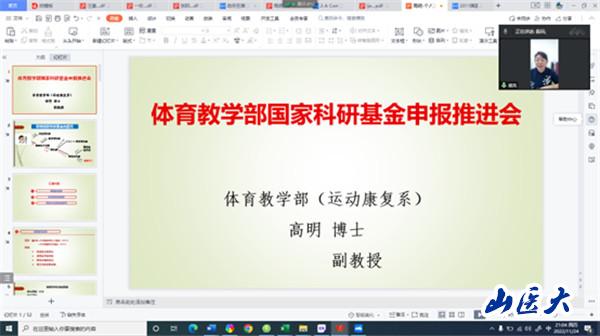 11月24日晚,體育教學(xué)部(運(yùn)動(dòng)康復(fù)系)以線上騰訊會(huì)議的形式召開(kāi)了2023年國(guó)家基金項(xiàng)目申報(bào)工作推進(jìn)會(huì),會(huì)議由直屬黨支部書記殷鳳主持。