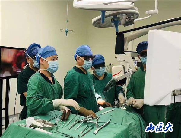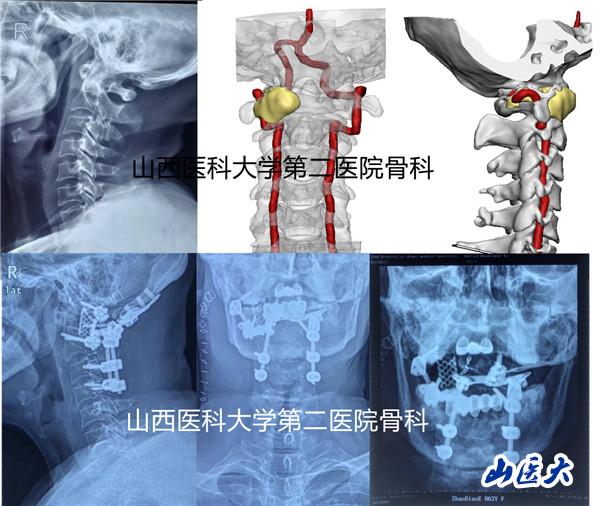 來自山西清徐的趙女士,出現頭暈、呼吸不適等癥狀,經檢查診斷為寰椎惡性腫瘤,輾轉多家大醫院就診,均因腫瘤侵犯頸椎高位,病情復雜,手術難度大被婉拒。患者最終來到第二醫院骨科就診,馮毅主任全面評估患者病情,認為其適合行寰椎腫瘤en bloc切除術,但手術面臨的挑戰和風險也是巨大的。因為患者右側椎動脈完全被腫瘤組織包繞,術中一旦出現椎動脈及脊髓損傷,將導致難以控制的大出血、腦干梗死、高位癱瘓、死亡等嚴重并發癥。再加之上頸椎解剖結構復雜、重要的血管和神經分布廣泛,可操作空間狹。胝榍諧琢霾⑿新拙弊抵亟晌僥焉霞幽。同時,圍手術期管理也都是對醫護團隊嚴峻的考驗。在與患者家屬進行充分溝通,獲得家屬支持與認同后,馮毅主任帶領武文杰、白軍軍、田志、陳斌等主力隊員,在血管外科史勇斌醫師介入栓塞腫瘤包繞的椎動脈助力下,麻醉及手術室團隊趙曉英副主任醫師的全力配合下,首先實施側方入路寰椎惡性腫瘤En bloc切除及枕骨-樞椎內固定重建術。經過五個半小時的奮戰,成功拿下腫瘤。同期,將患者取俯臥位,再次歷時三個小時,完成后路頸枕融合術。在3D打印技術、脊髓監護、3D顯微鏡、高頻超聲骨刀的助力下,手術不僅精準安全,而且將出血控制在1500ml以內。患者術后病情平穩,無并發癥發生,術前脊髓壓迫癥狀明顯緩解,術后一周患者恢復下地活動。