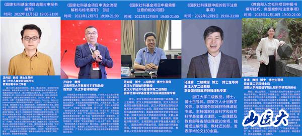 為進一步增強我校科研人員撰寫國家科學基金的能力,提高標書撰寫質量和中標率,切實做好2023年國家基金項目申報工作,學?蒲Ъ際醪坑12月1日至10日,組織各院系和附屬醫院科研人員參加了線上“國家基金項目申請全流程解析與標書撰寫技巧專題系列培訓講座”,每天進行一場專題講座。其中,1日-5日為國家自然科學基金項目申報系列講座,6日-10日為國家社會科學基金和教育部人文社科項目申報系列講座。